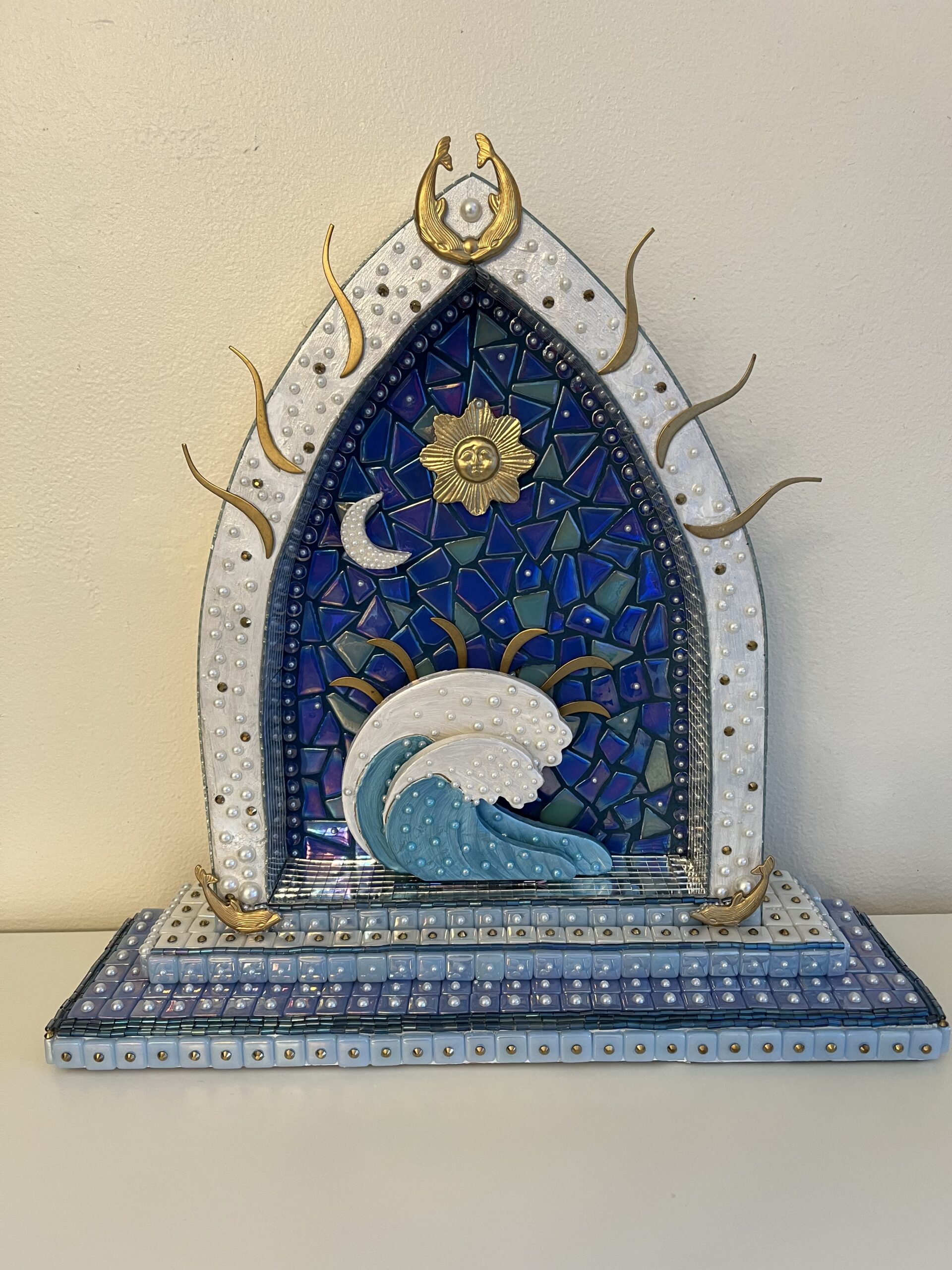 Shrine to mother ocean, using glass, beads, and handmade ceramic tile